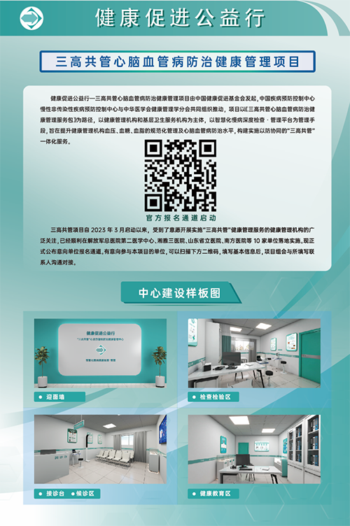 三高共管心腦血管病防治健康管理項目由中國健康促進基金會發起,中國疾病預防控制中心慢性非傳染性疾病預防控制中心與中華醫學會健康管理學分會共同組織推動,項目以《三高共管心腦血管病防治健康管理服務包》為路徑,以健康管理機構和基層衛生服務機構為主體,以智慧化慢病深度檢查·管理平臺為管理手段,旨在提升健康管理機構血壓、血糖、血脂的規范化管理及心腦血管病防治水平,構建實施以防協同的“三高共管一體化服務。